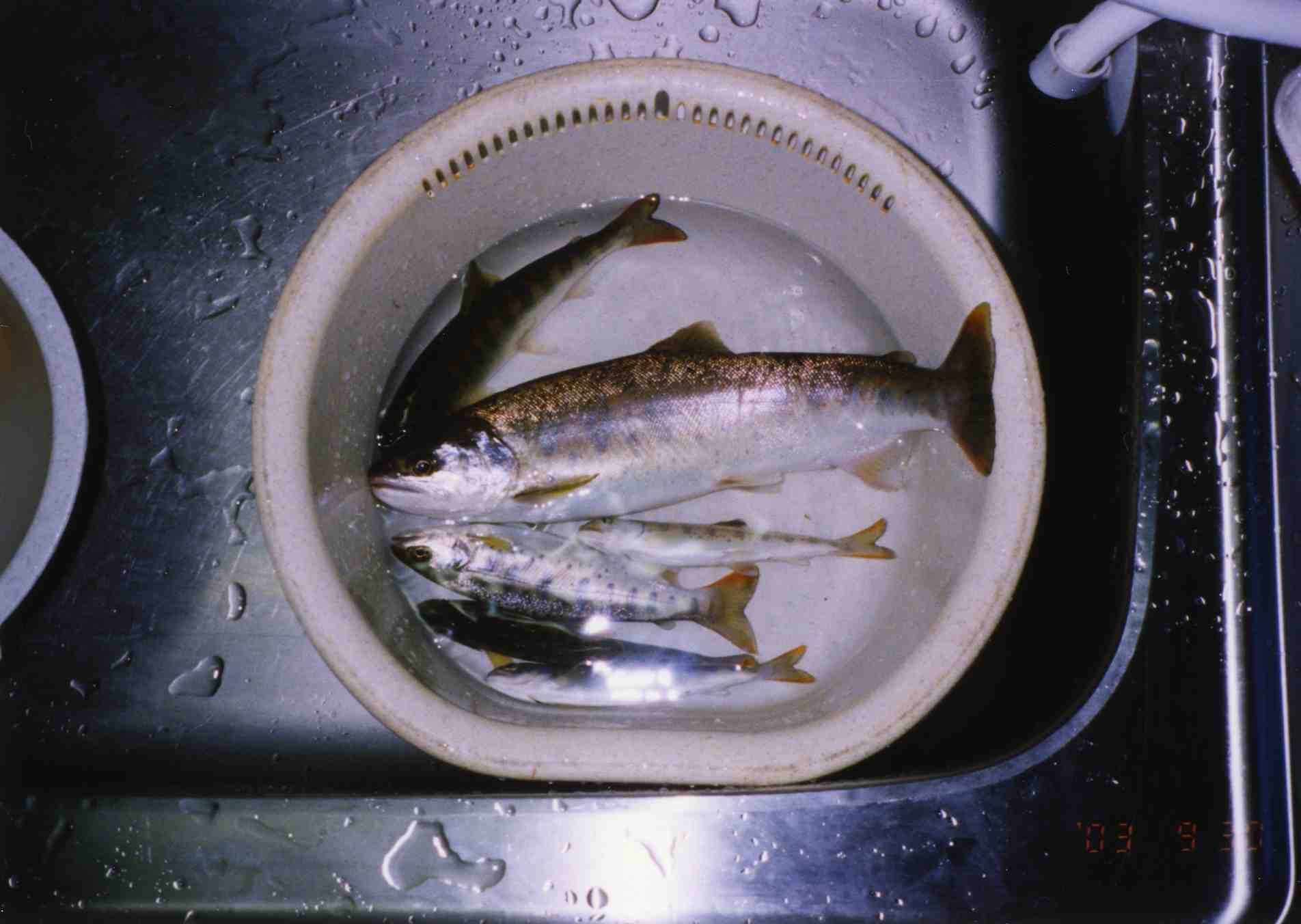 もう帰ろうかと迷った末,最後にもう1箇所立ち寄ることにしました。ここでもちびアマゴが退屈しない程度にアタックしてきます。強い流れの間の浅瀬にエサを流すと,目印が横走りしました。竿を上げると根掛かりのような感触です。すぐに泳ぎだし,魚体がくるりくるりと3回転しました。白い魚体です。ウグイか?アマゴか? 半信半疑で竿をためていると,針の掛かり所が良かったのか,顔が水面を割って,下流に流れてきます。待ち受けますが,タモにはとても収まりそうにありません。シッポから静かにすくい上げました。アマゴです!! 尺は間違いありません。パールマークはわずかに残っています。アユ用の船にようやく入るくらいの大きさです。生涯随一のサイズです。まったくびっくりです。ここの周辺でさらに2匹ほど追加して,午後2時にあがりました。
