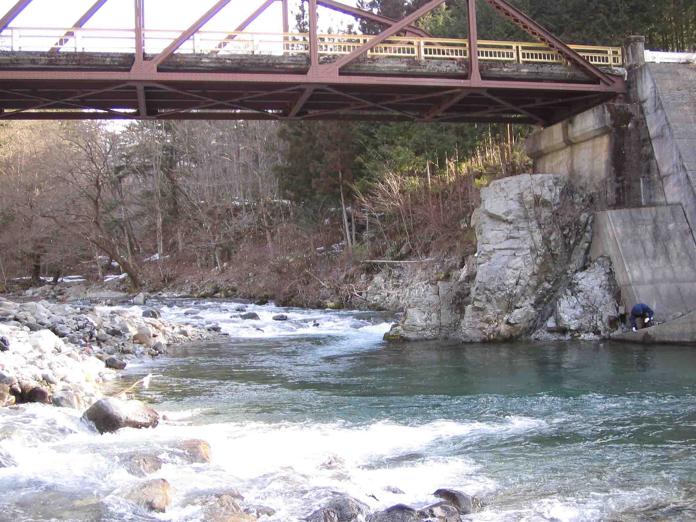 - 朝倉さんと2人で馬瀬川上流に行きました。可児を4時に出発。5時半には現地到着。漁協のHPによると上流部に放流されるというので、ひとつひとつ橋を確認していきますが、どこも数台の車が止まっています。淵がある広いポイントが広がる出合橋に車をとめて、まだ場所取りがされていない淵尻に荷物を下ろしました。既に到着している釣り人の話によると、放流は9時か9時半頃とのこと。それまで、川虫を採取したり、下流の瀬を探りました。川虫はたくさん採取できたものの、アマゴのアタリはありませんでした。9時過ぎに漁協のトラックが到着し、バケツ5杯を放流。しばらくして、ぽつりぽつりと掛かりはじめました。30分くらい経過したのち、1尾ばらし、朝倉さんが1尾ゲット。対岸のよどみにポイントに入った3人組は順調にかけています。自分達のポイントは本流の流れと流れ込みの強い流れが直角に交わるところで、仕掛けの流しが極めて難しい。うまく底にはいるとアタリがあるようです。結局、昼過ぎまでで、ふたりでようやく二桁といったところ。風が強くなり終了です。
