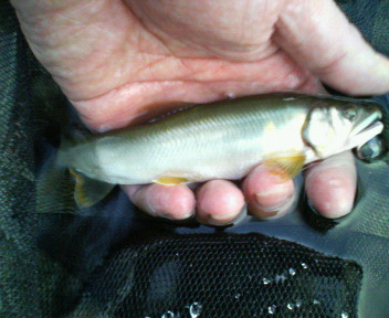 しかし、このポイントは根掛かりポイント。9時半に見切りをつけて、あっちをうろうろ、こっちをうろうろ。結局最初のポイントの500mくらい下流で12時まで竿をだしたが、魚影が少なく、型も小さいので終了とした。