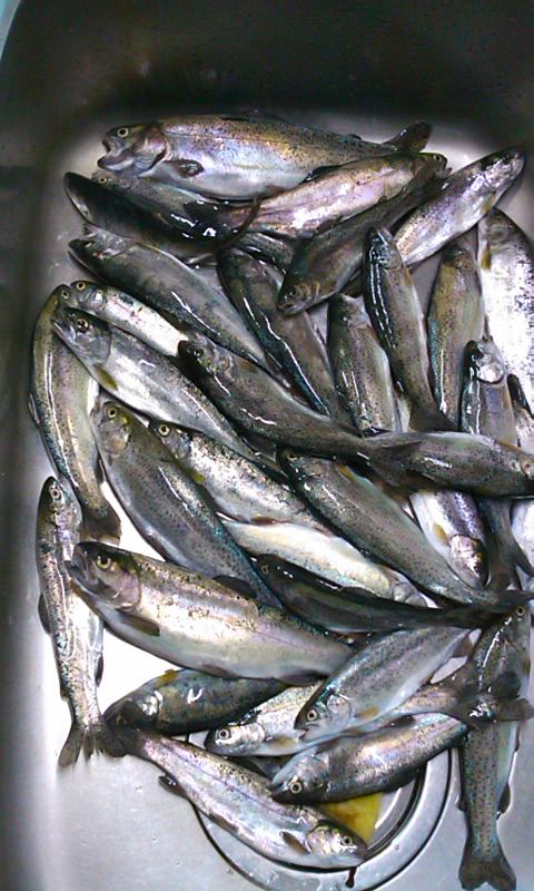 - 震災関係の支援に役所に1週間ほど行き、3交代を人生はじめて経験しました。明けの休みとなった26日に、前日に大会のあった阿木川に行くことにしました。何年か前に残りを結構釣った記憶が蘇ったということです。今回は水位が高いので、さらに残りが多いのではという期待で、現場到着は朝6時。皆同じことを考えているようで、結構な釣り人の数。2時間ほどで10匹、しかもニジマスばかり。帰ろうとしたところ、堰堤したの深い流れ込みのポイントが空いているので、そこを最後にしようとしたが。。。これが大正解。まず25cm、次に27cm、3投目には3分ほど掛かって尺のニジマスを釣り上げた。その後も入れ掛かりが続いたのは、養殖池の餌の時間と一致したからか??? アユの船がいっぱいとなる34匹となった。ニジマスの20匹ほどは薫製にしました。