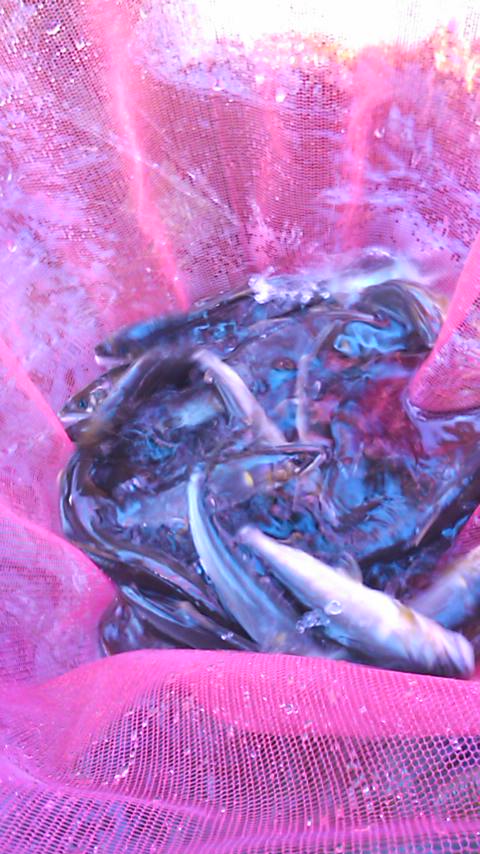 7時。JRの鉄橋下から攻めます。まず、段々瀬の3本の流れの一番小さい流れに養殖を入れます。一発です! それを親にして強い流れに入れて行きます。下の橋まで釣り下り、ここでは15匹程度。