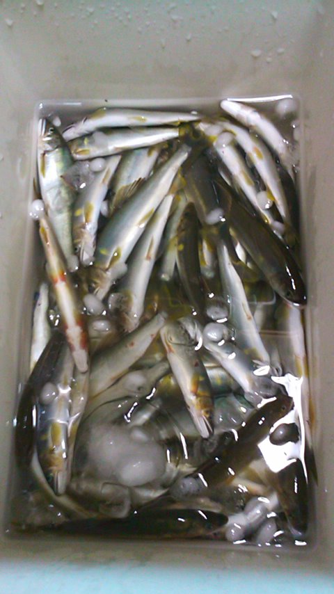 6時に高速を降りて、おとりを2匹購入。三菱電機の前の駐車場に止めて、堰堤下の段々瀬から開始です。ここで5匹。そこから下の堰堤まで下って5匹。前回、入れ掛かりがあった、堰堤から次の橋まではほとんど掛かりませんでした。橋のしたで何匹か追加して、前半は15匹。最初のポイントに戻り、堰堤の上を攻めます。橋の上流は分流になっており、右岸側に2人入っています。左岸側で竿を出すと、竿抜けだったようで、今日最大となる20cmが来ました。ここで5匹追加。さらに上流の堰堤の上を攻めます。ここまでのポイントはほとんど垢がついておらず、大きな石の残り垢狙いでしたが、ここの区間は川が出来上がっているようで綺麗でした。入れ掛かりのはじまりです。特に、9mに竿では電線に引っ掛かるポイントでは、超入れ掛かり。空中輸送でおとりが着水すると同時に目印が下流に走ります。ここで15匹ほど追加できました。さらに上流の堰堤下の強い流れでもポイントごとにアユが掛かり、舟が重くなって行きます。いつもは入らない市役所前の流れでも、ぽつりぽつりと掛かります。さらに上流の水遊びポイントでも追加でき、16時まで粘って58匹でした。