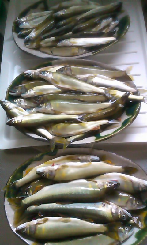 8時から9時、11時頃にピークがありました。15cm以上、12cmクラス、10cmクラスと、サイズがばらばらです。小さすぎても大きすぎてもおとりにはちょっとという感じです。昼を過ぎると、おとりをかえて針を変えるとぱたぱたと掛かり、段々サイズが小さくなって、それっきりという状態の繰り返し。それでも14時半まで粘って60匹でした。対岸の人は80は掛けていたと思います。竿が当たったり糸がからまることもありませんでしたので、上手な人だったと思います。