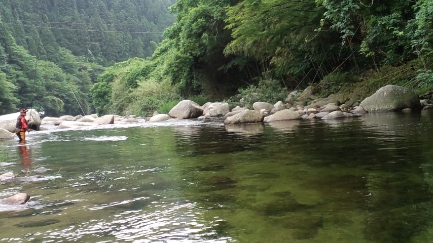 • 第2ラウンドは大杉橋。上から覗くと結構な人が入っています。ずっと下流に淵が見えるので、このポイントを目指します。が、行けども行けども、釣り人がおり、入るポイントがありません。下野でばっちりかためた人たちがいます。
