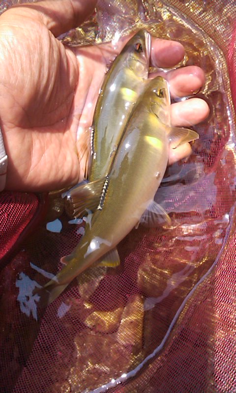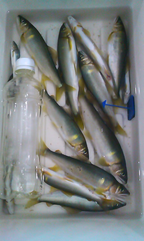 • さあ、今日からお盆休みです。まずはおとり調達で付知へ。付知もそろそろ平水になってきたようなので、最近竿が入っていないと思われるポイントに入ってみます。2時間、、、ノーヒットでした。川の真ん中を歩いてもアユがいるところがまったく分かりません。闇雲に竿を出しても掛かりそうにありません。別の川に向かいます。結構、人が入っています。まずは、一番下から。絶対にかかる場所で大きなアタリ。棚を2つ下られましたが、引き抜くと21cm超え。まるまる太っています。このポイントではこの1匹だけ。次にずっと歩いて上流に向かいます。堰堤下の段々瀬に入りますが、アタリがありません。最後の一番深いところ、1号のおもりにもうひとつ2号のおもりを付けて、20cmの養殖おとりをねじ込みます。目の前で目印がはじけ飛びます! 一気に段々瀬を2つ下られます。竿を立ててこらえようとしますが、全く歯が立たず、、、複合005を簡単に切って行きました。複合006に張り替えます。もう一度同じポイントに入れると、21cmが掛かりました。これは簡単にあがってきたので、先ほどのがどれだけ大きかったのか。。。さらにもうひとつ上の橋まで歩いて、強い流れを攻めると、ここでは3匹追加できました。いずれも20cmクラスです。さらにもうひとつ上の橋へ。上流に入っている人が往復して竿を入れた後のようですが、アユを残しておいてくれたようです。狙ったポイントで次々と鋭いアタリがあり、20cm級が飛んできます。20mほどのポイントで5匹稼ぎました。今日は10匹だけでしたが、型揃いでした。