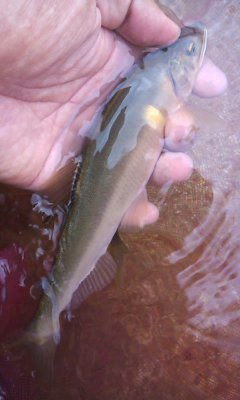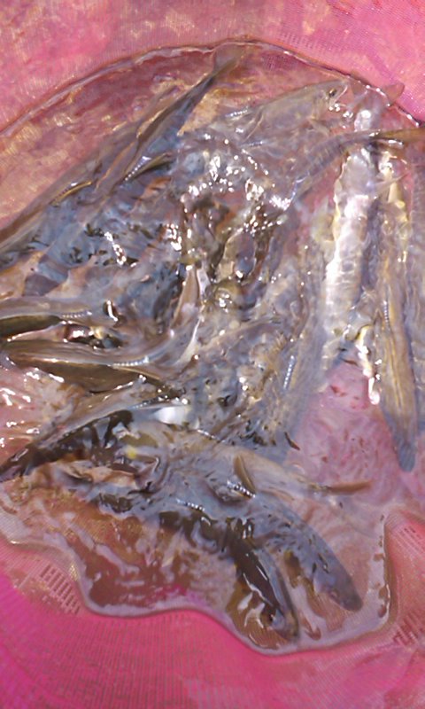 - 幸先がいいですが、その後30分ほど掛からず。ずっと上流に向かいます。前回、入れ掛かりがあったポイントに入りますが、魚影が見えません。ここで雨が降ってきたので、雨宿りしながら休憩です。近くのポイントで2匹。更に上流の堰堤を超えて、強い流れのポイントを攻めます。そこから次の水遊びポイントまでぽつりぽつりと稼いでツ抜けです。さらにもうひとつ堰堤を超えて行きますが、50mで1匹くらいのペースでしょうか。次の堰堤上では魚影が見えなかったので、ずっと下ります。最後の堰堤は釣り専用区の旗があったのですが、これには騙されました。一人釣り人が見えますが、かなりのペースで釣り下っていきます。こちらはゆっくりポイントをつぶして行きます。朝とばしたポイントを丁寧に攻めて、ここでもぽつりぽつりと稼いで行きます。釣り人が近づいてきました。鮎ルアーで掛からないので、おとりを売ってほしいとのことです。舟の鮎をタモを開けるとどっさり出てきたので、お金を払うということですが、ここは気前良く2匹進呈しました。阿木の人なので、店によってくださいとのことです。14時過ぎに雲行きが怪しくなったので終了としました。27匹。ほとんどが20cmを超えています。