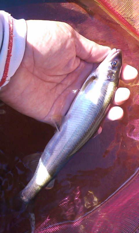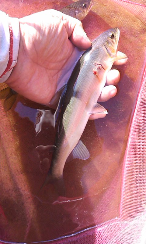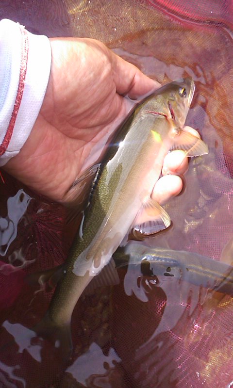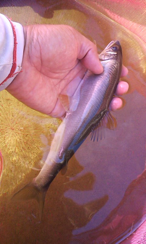 - 週末に付知が良い状態になるのは久しぶりではないでしょうか。管内の小河川は湖産鮎のため、早めに終了です。今日は付知です。込みそうなので5時半に出発します。喫茶JBでおとりを調達しますが、近くで尺鮎がでたそうです。下流に戻り、知原橋から入ります。今日は小学校の運動会のようで、子供達が楽しそうに挨拶してきます。橋下には一人入っていたので、ずっと下流の強い流れのポイントに向かいます。2.5号のおもりを付けて強い瀬が終わるところに誘導すると、鋭いアタリがありました。一気に下っていきます。ここは足場が悪いので、鮎について行けません。何度も転び、とうとう竿と糸が直線になってしまいました。もうダメかと思いましたが、なんとか竿先を左右に振って流れの緩いところに落ち着いたところで、大岩の上を走って下流に行きます。胸びれのところにがっちり掛かっていたので外れませんでした。26cm!!