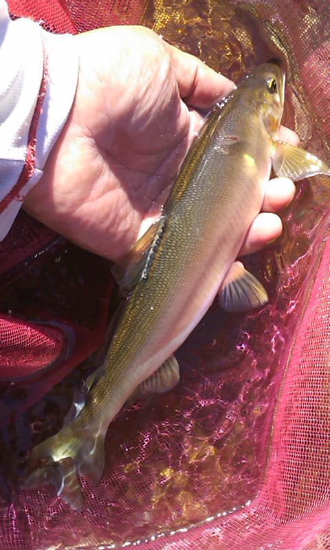 • 町内の草刈りがありましたが、早出をして1人分のノルマをこなしてから出発です。朝倉さんの家を9時出発。10時過ぎに吉田川に到着しました。最下流部で10匹ほど掛けている人がいるようです。がまかつのフィールドテスターとのことです。朝倉さんは緩い流れで泳がせ、自分は急瀬を攻めます。急瀬ではアタリがありません。3匹目の養殖が弱ってきたころにようやくヒット。20cmの天然遡上でしょうか。これを深いところに入れると、一発でこの日一番の25cm! その後、やや退屈な程度でぽつりぽつりと掛かり、16時過ぎまで粘って12匹でした。午前中はアタリが弱く、午後は強いアタリが多かったです。この時期、やはりメスをおとりにすると掛かります。メスが多かったのですが、ほとんどは卵を抱いているようです。郡上もそろそろ終了でしょうか。