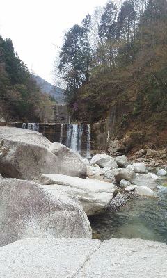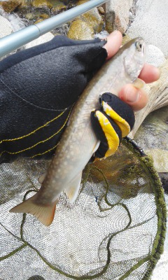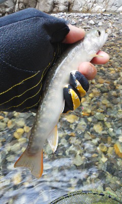 恵那山登山林道は通行止めなので、今回も対岸から入ります。先行者はいませんが、河原には明らかに昨日の足跡があります。期待はできません。前回に比べて水位は30cm以上減っていると思います。前回は断念した遡行もあっさりできるようです。まずは、この遡行できなかった淵のポイントを攻めます。2投目でアタリがあり、5投目でヒット。かなりやせたイワナが上がってきました。23cm!