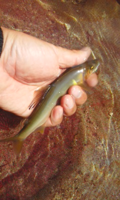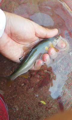1匹目は実に2時間以上経ってから、8時半でした。オトリと同じくらいのサイズのアユが掛かりました。