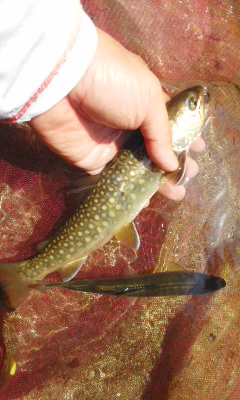 続けて2匹でストップです。掛かった3匹を循環させますが、また長い時間が過ぎます。再度養殖を持って、上流の強い瀬のポイントを探りますがノーヒットです。淵に入る最後の段々瀬でようやく掛かりました。ちょっと大きいです。勢いよく沖に泳ぎその後淵へと泳いで行きました。複合の005を張っていたので、思い切って抜こうとしましたが、ちょっと荷が重い感じです。淵に近づき鼻管糸をつまもうとしましたが、あまりに大きな魚体にびっくりして手を引っ込めてしまいました。再度泳がせて弱らせてからすくい込みました。イワナです。25cmを超えていそうです。胸ヒレに掛かっていました。それにしてもこの手応え、解禁のときの手応えに比べると軽いものです。解禁に掛けたのはいったいどれだけ大きかったのか。。。