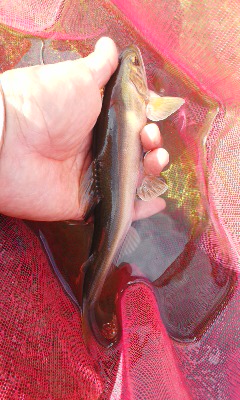 その後、昼前後からまわりでも掛かるようになり、自分にも22cmの雌鮎が掛かりますが、これが再度の根掛かりでロスト。2時間ほどで20cmオーバーの雄を3匹追加しました。雄の泳ぎは悪いので循環が悪いです。いずれも養殖で掛けたものです。残念なことに、自分のすぐ近くでバシャッと音が聞こえた時には引き舟の蓋が空いており、大型の鮎が逃げてしまっていました。結局、7匹掛けて2匹根掛かり1匹逃走で、残りは雄ばかり4匹でした。朝倉さんは10匹ほど掛けて残りは7匹、名人は調子があがらず残業をするとのことで、15時にお先しました。