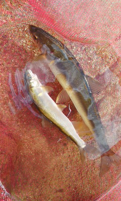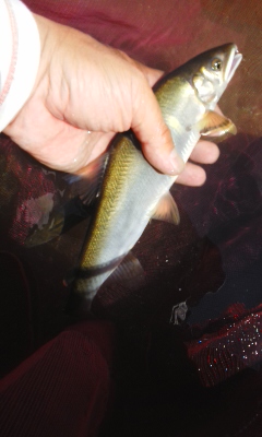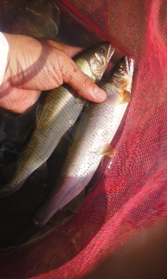 今日もよい天気ですが、日曜日と同様に鮎の姿が少ないです。朝の寒さのせいで落ちたのでしょうか。その後も24cmから26cmの型がぽつりぽつりと掛かります。 気がつくと、回転しながら上に登る2匹の鮎がいます。どんどんこちらに近づいています。オトリ鮎と掛かり鮎のようです。あわててタモを差し出しますが、すくえるわけがありません。と思いきや、石のまわりを1回転してあっさりタモの中に入りました。 今日は4時まで粘って、6匹+2匹でした。朝倉さんが撮影してくれたビデオです。 |