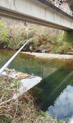 - 週末は気温が上昇する予報です。亀尾島川に入ってみますが、生命反応がありません。30分ほどで見切りをつけて、成魚放流のある小駄良川に向かいます。3年ほど前に、地元の人が、ここの川に放流されるアマゴは奇麗なので通っているということを聞いてから、毎年かよっています。ひとつ上流の橋にはもう止められないくらいの車ですが、いつもの橋には5台ほどしか止まっていません。ちょっと危険なポイントが空いていました。1時間ほど待って、8時50分頃に放流が始まりました。バケツの中のアマゴはサイズが小さいようです。橋直下のポイントに入ったひとにはポンポンと掛かっていますが、それ以外はまったくです。自分にも1時間ほど掛かりませんでした。そのうち、イクラは食わないね、と話しているのを聞きました。イクラがダメとは思いもしませんでした。亀尾島川で採取したキンパクに替えると一発です。16cmほどの小振りで奇麗なアマゴが掛かりました。それでも食いがものすごく渋く、キンパクの頭だけかじっていきます。細糸に変更です。これでようやく掛かるようになりました。そのうち気温が上がったせいか、自分のちょっと上流の浅瀬に多くのアマゴがまわってきました。調子良く掛けて、13時まで粘って14匹でした。一時はどうなるかと思いましたが、まずまず楽しめました。