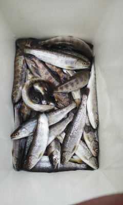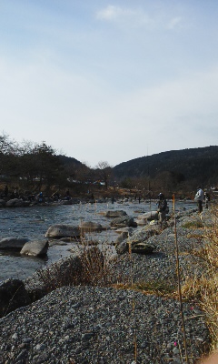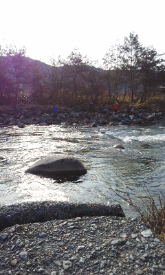 - いつものポイントに入って2時間の待ち時間ののち、8時半スタート。朝のうちは渋かったですが、日が昇ると目印に飛びつくくらい活性があがりました。後から入った人が、自分のポイントの目の前の石のうえに上がって、こちらにも竿を出すのには閉口しましたが、午後3時近くまで楽しみました。ルアーにも追ってきますが、なかなかヒットしませんでした。結構、釣り残しが多かったのではないでしょうか。