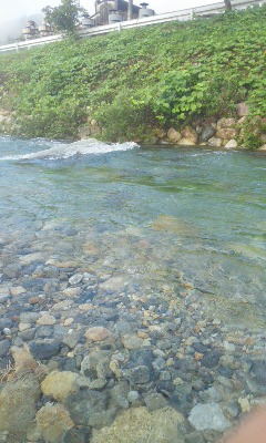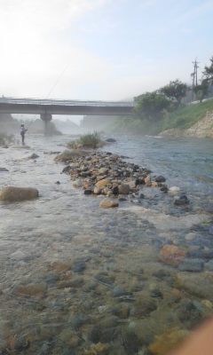 • ホームグラウンドの解禁は18日でした。直前までいく予定をしていましたが断念。気象庁と国土交通省の水位のデータを見ながら、19日はなんとしても行きたいところです。中津川も阿木川ももう少し減ってほしいところです。川上川の水位データはありませんが、昨晩に75mmの雨量を記録していてダメそうです。4時に起きて、阿木川下流はバツ、中津川も濁ってバツ、川上にくると、なんとか出来そうどころか、水も透明。でも下流は誰もいません。上流の道の駅の前にはすでに車が4台。いそいで戻って車屋さんのおとりを買いに行きますが人気がありません。無人販売になっていました。こんなのは初めてです。2匹1000円。道の駅の前にはすでに竿を出している人がいるので次の橋に入ります。一番乗りです。遠くからは竿が出せそうでしたが、近づくと、やはり水位は高めでポイントが少ないです。直ぐに男女2人組が入ってきます。派手な舟を持っている人は、昨年阿木川で会ったゆうさんです。挨拶だけして、直ぐに竿を出します。石裏のゆるい流れにいれて10分。オトリサイズの鮎が掛かりました。こんなポイントですが、下流側で写っているのがゆうさんです。