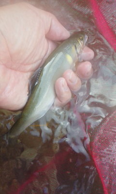 • 同じポイントで粘っても掛かりが遅いので、どんどん上流に向かいます。ゆうさんの旦那さん?と代わりばんこに移動するような感じです。いつも掛かるポイントでは、黄色い鮎が、さらに20cmオーバーも掛かりました。