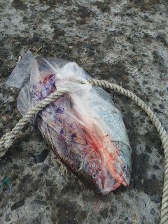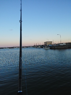 まだ暗い中、2番手で到着。すぐに会社の人も到着です。最初の人の隣に入り、釣りを開始しますが、まだ暗いため浮きは見えません。少し明るくなり始めたころ、少し離れた岸壁でヒット(結局、ここでは爆釣モードに突入)、やがて、自分にもあたりがありました。大きく合わせると、白い魚体が見えました。これはメスだったようです。4.5kgクラスです。さらに次の1投で同サイズの雄が掛かりました。3匹目はばらしてここまでかと思ったところ、さらに3本目が掛かりました。やや小ぶりでしたが、大きなイクラが入っていたようです(後でさばいてもらったので実物は見ていません)。同行した人は2バラシのみだったので、次の日もチャレンジ。
