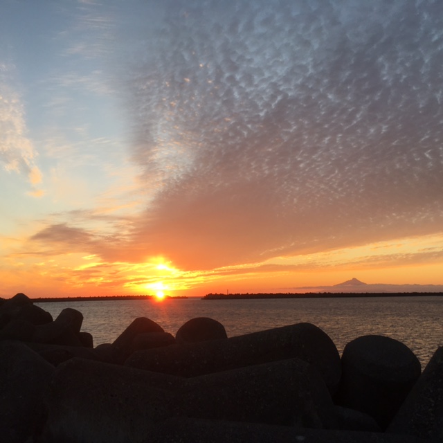 防波堤を歩いていると、今まさに日が沈む瞬間。100m歩かないうちに沈んでしまいました。
