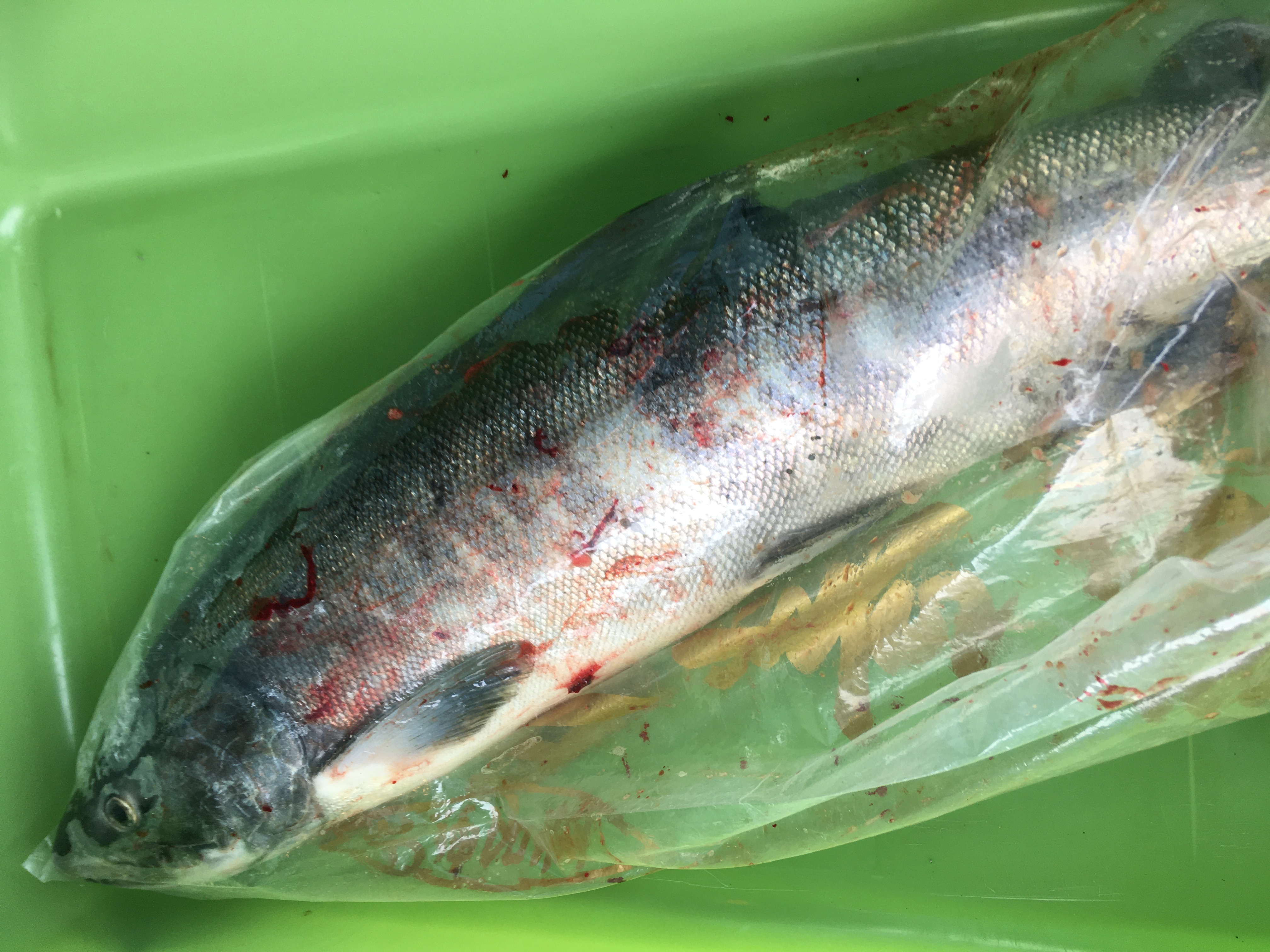 6時頃、聞き合わせで、ずっしりとした手応えがありましたが、直ぐに軽くなりました。直ぐにその場所に投入すると、再度当たり! 2週間振りに釣ることが出来ました。ちょっと色が入ったオスです。