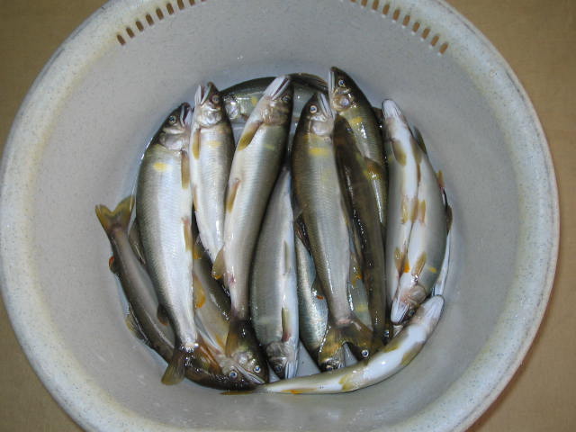 - 今日も家族を連れてゆっくり出発。まるで休日並の混雑の付知を横目に,一路白川に。かねふくさんでおとりと日券を購入して,加子母村へ。先々週に下見をしておいたポイントに入る。パラソルや浮き輪や卓上コンロまで川におろし,あとはまかせて,自分はさっさと釣りを開始。50mくらいのポイントを一往復して17匹。段々瀬のアユは当たりも引きも強烈。狭い川幅いっぱい走り回りまわる。それにしても今年はどうなってしまったのだろう。ここ数年,二桁はおろか,5匹も釣れない日ばかりが続いたが,今年は二桁ばかり。道具や腕が格段に進歩したわけではないので,アユの状態が良いのだろう。