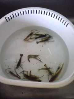 - 2日は、そろそろ釣れはじめた手長エビを狙いに、木曽川へ。高速の渋滞をさけるため、手長エビ釣りにしては早い6時出発。1時間ほどでいつものポイントについたが、どうも水況は悪い。小潮のためか、魚の姿もあまり見えない。1時間に1〜2匹のペースで、ちょっと変化のあるテトラの穴でぽつりぽつりと釣れる。やっぱりまだ早いようだ。4箇所ほど場所を変えて、計18匹。ちょっとしたおつまみになったくらい。