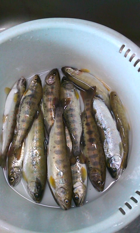 - 震災関係の支援に役所に1週間ほど行き、3交代を人生はじめて経験しました。明けの休みとなった26日に、前日に大会のあった阿木川に行くことにしました。何年か前に残りを結構釣った記憶が蘇ったということです。今回は水位が高いので、さらに残りが多いのではという期待で、現場到着は朝6時。皆同じことを考えているようで、結構な釣り人の数。2時間ほどで10匹、しかもニジマスばかり。帰ろうとしたところ、堰堤したの深い流れ込みのポイントが空いているので、そこを最後にしようとしたが。。。これが大正解。まず25cm、次に27cm、3投目には3分ほど掛かって尺のニジマスを釣り上げた。その後も入れ掛かりが続いたのは、養殖池の餌の時間と一致したからか??? アユの船がいっぱいとなる34匹となった。ニジマスの20匹ほどは薫製にしました。