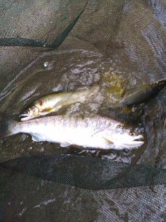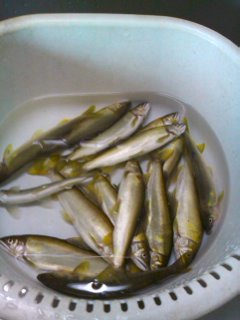 - 先週の休日出勤の代休をとっての釣行です。6時に朝倉さんをピックアップして7時過ぎに根羽川漁協に到着。解禁以降、連日釣れています。そのせいか、漁協の駐車場にはすでに多くの車がありました。日釣り券とおとりを購入します。おとり1匹500円。そのおとりのなんと小さいこと。15cmくらいしかありません。おとり缶、船、たも、足袋を消毒します。冷水病対策ですが、どれほどの効果があるものか? でも、釣れれば勝ち組です。月瀬大杉の橋からのぞくと、上流があいています。ここに入ります。大石がごろごろあるポイント、小さな淵のポイントが2つ、そして瀬のポイントです。小さな淵のポイントから始めますが、30分あたりはありません。おとりが弱ってきました。おもりを付けて、淵尻に流すと、凄いあたりです。そのまま瀬に下ります。慎重によせて抜くと17cmの黄色いアユ。瀬を攻めると、5連チャンです。とてもアユがいるような石の状態ではないのですが、ちょっとした深みにいるようです。その後、朝倉さんが降りてきました。釣れないところで粘ってしまったようです。天然アユを補給すると、1発で掛かりました。頭上に木が被さっているポイントなので、竿抜けだったようです。自分は、その後、淵のポイントで上飛ばしで掛けて計20匹。朝倉さんはばん回して6匹。浅いところでは全く掛からなかったので、一度増水した方が良いようです。