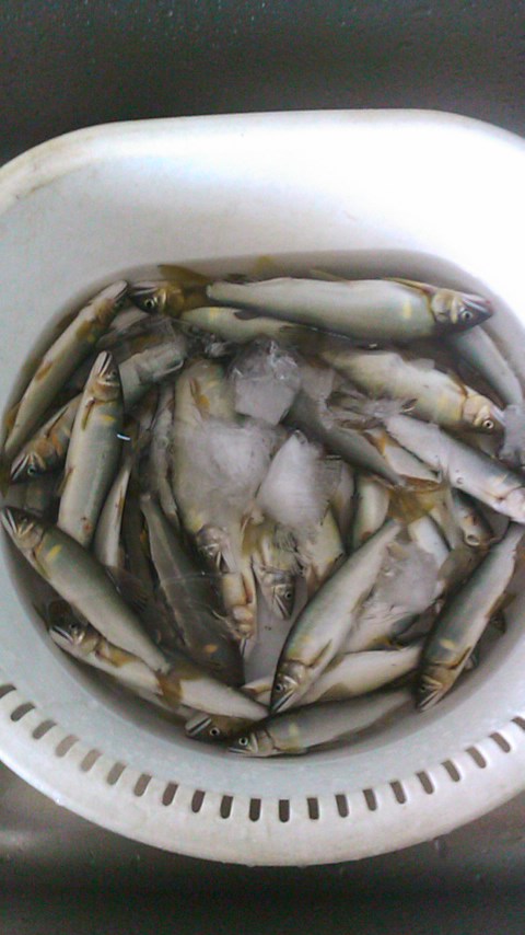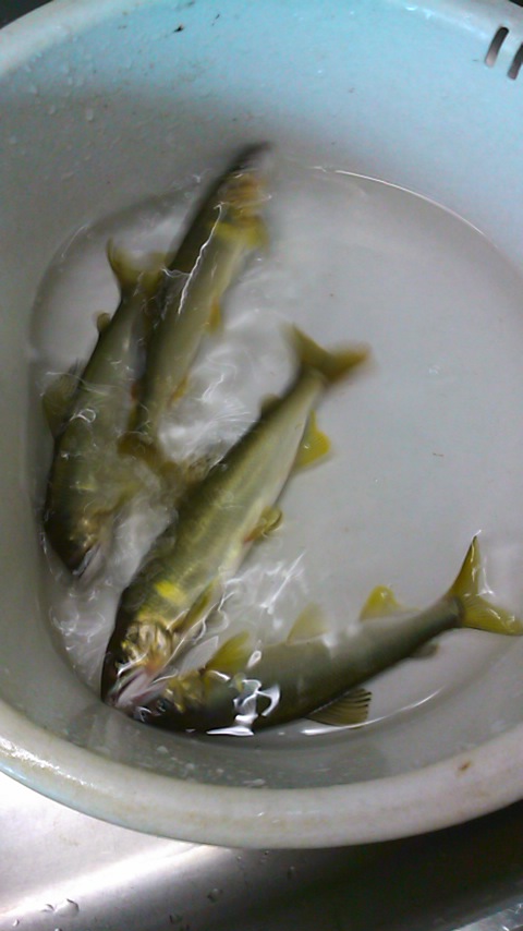 - 翌日の中津川の解禁に備えて、おとりを確保します。社宅の草刈りの後、10時に出発です。どの川も増水しているので、水引きの早い黒川に行ってみます。上流から眺めて行くと、目指すポイントには、これから入る釣り人が。。。おとり屋に向かいますが、近いところは閉店の模様。結局、最下流まで行ってしまいました。かつて朝倉さんたちと入った中流域のポイントに向かいます。30分ほどさぐると、強い流れの中で1匹。上流の同じようなポイントを探して行きます。50mに一匹の割合。3匹目は大きく、手のスパン23cmに僅かに届かない22cmです。今シーズン最大。でも、これは中津川のおとりにできません。11時から2時までの3時間で4匹。アユは薄い感じでした。