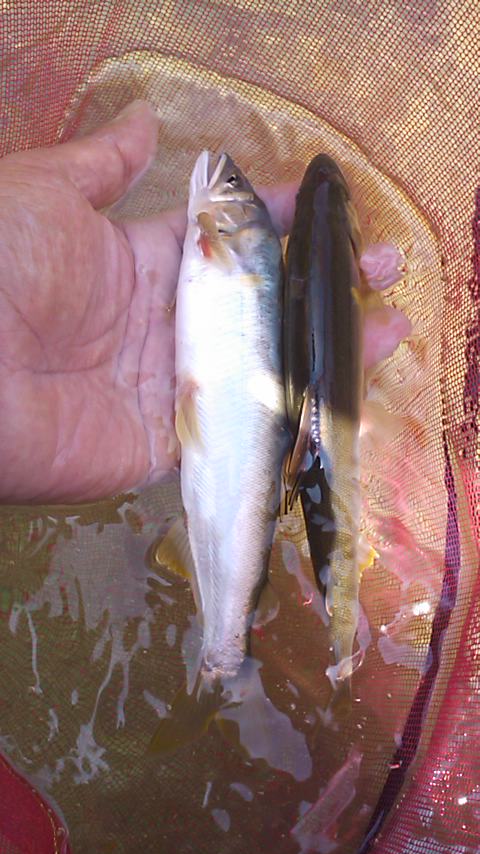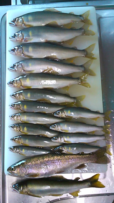 6時に高速を降りて、おとりを2匹購入。三菱電機の前の駐車場に止めて、堰堤下の段々瀬から開始です。ここで5匹。そこから下の堰堤まで下って5匹。前回、入れ掛かりがあった、堰堤から次の橋まではほとんど掛かりませんでした。橋のしたで何匹か追加して、前半は15匹。最初のポイントに戻り、堰堤の上を攻めます。橋の上流は分流になっており、右岸側に2人入っています。左岸側で竿を出すと、竿抜けだったようで、今日最大となる20cmが来ました。ここで5匹追加。さらに上流の堰堤の上を攻めます。ここまでのポイントはほとんど垢がついておらず、大きな石の残り垢狙いでしたが、ここの区間は川が出来上がっているようで綺麗でした。入れ掛かりのはじまりです。特に、9mに竿では電線に引っ掛かるポイントでは、超入れ掛かり。空中輸送でおとりが着水すると同時に目印が下流に走ります。ここで15匹ほど追加できました。さらに上流の堰堤下の強い流れでもポイントごとにアユが掛かり、舟が重くなって行きます。いつもは入らない市役所前の流れでも、ぽつりぽつりと掛かります。さらに上流の水遊びポイントでも追加でき、16時まで粘って58匹でした。