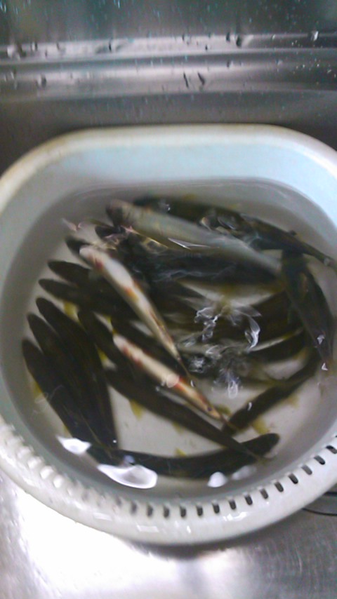 - よく雨が降ります。ようやく水位が下がって、中津川では竿が出せる状態になりました。いつものように6時すぎにおとり屋さんに到着。6時半から、鉄橋の上から開始します。おもりを付けて、流芯わきの緩やかな流れに入れると、一発、二発、幸先が良いと思ったのですが、次が来ません。どんどん釣り下って、鉄橋近くまで来てしまいました。ここの大石裏で20cmが来ました。これはおとりにできないので、竿をたたんで、堰堤下に行きます。ちょっと下に釣り人が入ってしまい。思うように攻めることが出来ません。ここで2匹追加して、3匹目は凄い引きであっという間に外れてしまいました。再度、竿を畳んで、下流の橋の下に入ります。が、下流はぱっとしません。上流に釣り上がります。橋の下は竿抜けになっていて、ここで何匹が追加しました。前半戦は12匹。