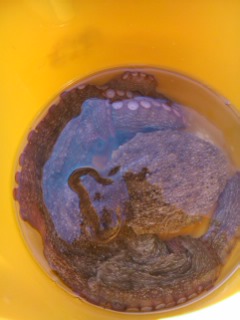 場所を変えてすぐに大型の当たりがありました。丸まる太った白い魚体があがってきました。しっかり針掛かりしていることを確認して引き抜きました。これまでで一番の大物です。今晩のテッサと鍋の具は確保しました。続けて、ずっしりとした手ごたえがあり、赤い物体があがってきました。タコです。タモをお願いして船にあげました。嬉しい外道です。釣行後に寄った豊浜のおさかな広場では、同じ大きさのタコは3000円以上で売っていました。その後、次男坊は中型を2匹、小型を1匹あげました。予想通り、11時以降はぱったり釣れなくなり、結局、自分は3匹、次男坊は4匹で終了しました。