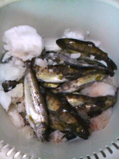 - 5時すぎに準備を始めると、上流から2人組が歩いてきました。どうやらここのポイントから入るようです。挨拶すると、すでに場所取りも置いてあるとのこと。先行者もいるようです。がっかり。。。仕方なく、後をついて行き、降りたところで明るくなるのを待ちました。2人組みはちょっと下流に降りて行きました。淵のポイントがあるようです。大粒の雪が降る中、周辺のポイントを探ると、昨年に放流したチビアマゴが飛びついてきます。下流に降りて行き、深みを探ると2匹釣れましたが、続きません。先行者もそれほどでも無さそうです。こうなると、当日放流を目指してさっさと場所変えです。粥川と本流の合流点も放流場所のはずですが、魚は見えません。吉田川の下流でもすでに魚は見えないようです。中学校前、住宅前と見てまわり、鶴佐橋に辿り着きました。ひとりがあがってきました。20匹ほど釣ったようです。ここで降りて行くことにしました。さらに2人があがり、結構、ゆったりと竿を出せるスペースが出来ました。みんなぼちぼち釣ったようで、のんびりムードです。なかなか厳しいですが、ハリスを015までおとして、キンパクの餌でぽつりぽつりと掛けます。それにしても降りしきる雪は、ダイワの防寒着をしだいに濡らして行きます。このポイントで11時から14時まで粘って15匹を追加しました。まるで修行のような解禁日となりました。