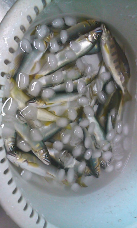 - 1年で一番愉しみな恵那漁協管内の小河川の解禁。前日におとりを購入しついでに川の状況を見てみます。やはり高いです。解禁でなければ行かないような増水です。濁りもあります。テレメータ水位を何度も見て、2時半に出発です。中津川市役所前の駐車場で1時間ほど時間を過ごし、5時に竿だしです。上流の堰堤上に3人、ずっと下流に1人しかいません。はじめからおもりを付けます。養殖の1匹目は、なぜが左に左にと泳ぎます。30分ほどしてようやく掛かったと思ったら空中ばれ。。追いが弱いです。さらに30分。ようやく1匹目がかかりました。ここから、引き釣りでぽんぽんと掛かりました。朝日が顔を出すと、やがて快晴になりました。なんとかおとりが繋がる厳しい釣りです。やがて、釣り人が多くなり、自由に動けなくなります。川を歩いてもアユが走りません。川上川や落合川にも阿木川ダム産を放流しているようなので、中津川の放流量が少なくなったのでしょうか? ちょっと心配です。