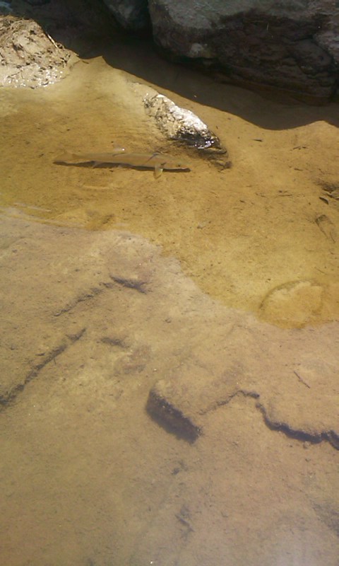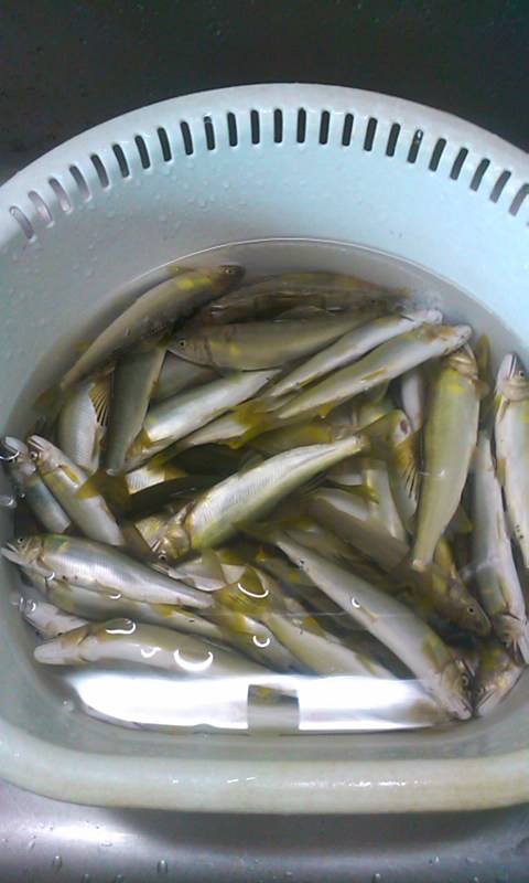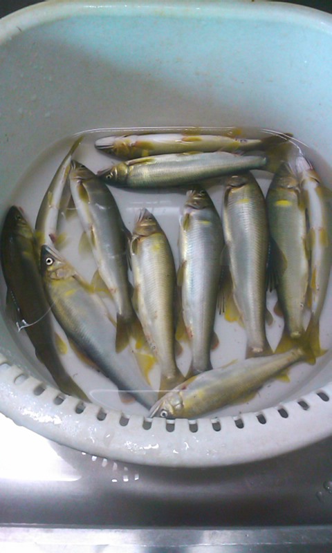 - 今週も金曜日に夏休みを取って中津川へ。平水近くになり、垢もついているはず。今シーズン最高の状態のはずです。。。いつものように6時に高速を降りて、川を見ながらおとりやさんへ。今日は誰もいません。大型を釣って付知に向かうか、数を狙うか。。。迷ったあげく、数を選びました。6時半から中流部を攻めます。堰堤下で2匹。ずっと下がりながら竿を出していきます。町中の暖かい水が入るところでは、ぱたぱたと釣れました。さらに堰堤の下を攻めますが、ここがまったくダメ。去年は80釣れたところなのですが、、、消防署前のポイントでも掛かりません。浅い棚で何匹か掛かりました。市役所前の深い流れでも引いて何匹か掛かりますが、これが今シーズン最高とはとても言えません。11時までで30匹でした。次は落合川に向かいます。もちろん、誰もいません。何年か前に次男坊が解禁日に24cmを釣った淵のポイントから攻めます。簡単には掛かりません。ここではチビが3匹ほど。ここで減水時に逃げ損ねた魚を発見。25cmはありそうです。アユかと思いましたが、どうやらアマゴのようです。塩焼き、塩焼き、とタモで追いかけると、、、なんとウグイでした。がっかり。。。気を取り直して、さらに下流の段々瀬を攻めます。ここから一変します。1つの棚で20cmクラスが掛かります。解禁以降、誰も竿を出していなかったのかもしれません。14時まで釣って20匹。合計50匹となりました。