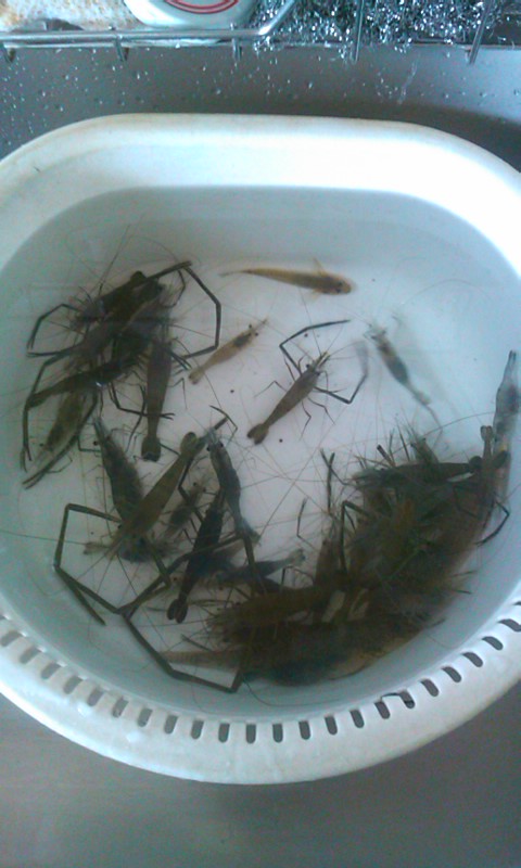 - 次男坊が所属するサッカーチームは今週いっぱいナイターリーグに参加しています。強豪チームに勝って、次の大会に進めそうです。日曜日はコーチ陣が集まらないようなので休みになりました。もちろん、手長エビ釣りです。今日はのべ竿4本で攻めることにしました。いつものポイントが空いています。ちょうど下げ潮で釣りやすい状況です。50mくらいの範囲を行ったり来たりして手長エビを掛けて行きます。12時終了しましたが、50匹は越えていると思います。写真は活かして持ち帰ったものだけで、現場で死んだのは別に同じくらいあります!!