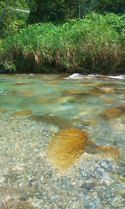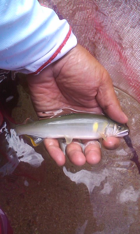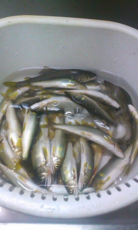 - 朝一は小学校の奉仕作業で、グランドの側溝の清掃です。2時間かかり、汗だくに。。シャワーをあびてから出陣です。中津川でおとりを調達して川上川に向かいます。昨日のポイントには5、6人が入っています。上流にも2、3人。さらに上流はいないようです。渓流相の良いポイントが続きます。一番きつい段々瀬は最後にとっておき、途中のゆるい流れから開始します。おとりを入れるやいなや、20cmの魚体が白い、美しいアユが掛かりました。追い星が真っ黄色でひれがオレンジです。移動しながらポイントごとに掛かりました。水もきれい、景色も良い、アユも美しい、ポイントが多い、、、いい川です。12時から16時までで32匹でした。