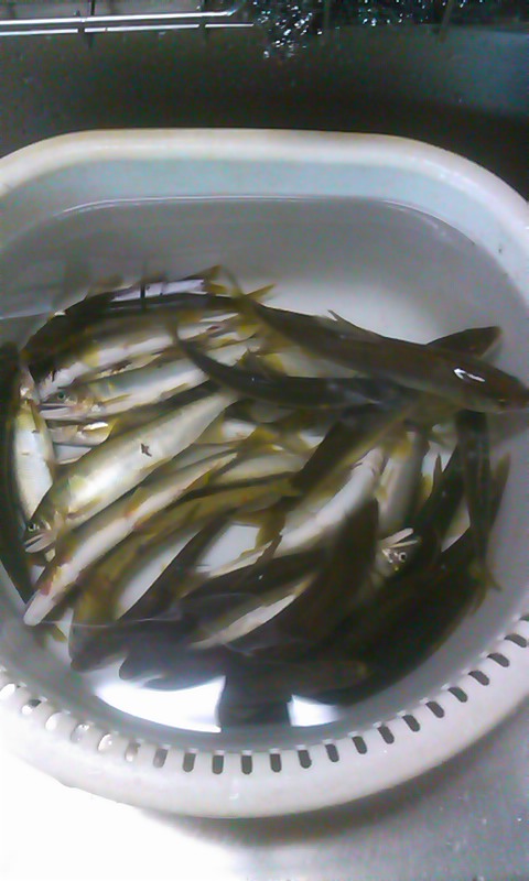 - 朝一は、次男坊のサッカーの練習ついでに、焼津遠征の荷物の泥おとしです。9時半に出発し、中津川へ。めずらしく、おとりを切らしているとのことで、川上川に向かいました。上流におとり屋さんがあったはずです。自動車整備工場でおとりを置いていました。状況を聞いてみると、なかなか掛かっているようです。お勧めのポイントを教えてもらい、そこに向かうと、先行者が3人も。。。入川場所にはおとり缶が2つも。目の前にはいかにものポイントがありますが、竿が入っているはず。その奥に見落としやすい、かくれポイントがあります。中くらいの石4つに囲まれた浅いポイントです。そっとおとりを入れると、強烈は当たりです。23cm! 結局、これが本日最大でした。雨雲の通過や、雷鳴のために何度も竿を畳みましたが、へちのポイントを丁寧に攻めて、実質2時間半で22匹の良型を揃えました。