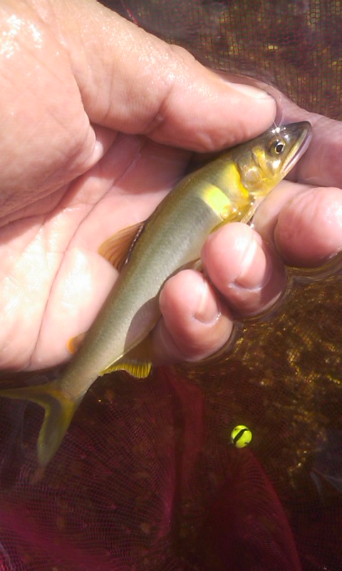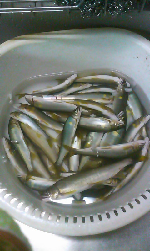 - 土曜日は仕事のため、振り替え休日をとって平日釣行です。今日は朝倉さんといっしょです。6時過ぎに中津川のおとり屋さんでおとりを購入。市役所下のポイントを30分ほど探りますが、ノーヒット。川上川に移動です。河川公園の下流のポイントを朝倉さん、上流を自分が釣ります。ここでは5匹ずつ掛けました。さすがに魚影は薄くなっています。車でちょっと上流のポイントに移動です。さすがに川幅が狭くなるので、朝倉さんは苦戦しています。自分は前回釣れたポイントが分かっているので、どんどん掛けながら移動していきます。ここでは21匹を追加。もう一度最初のポイントに戻って、さらに5匹を追加。今日は31匹でした。
