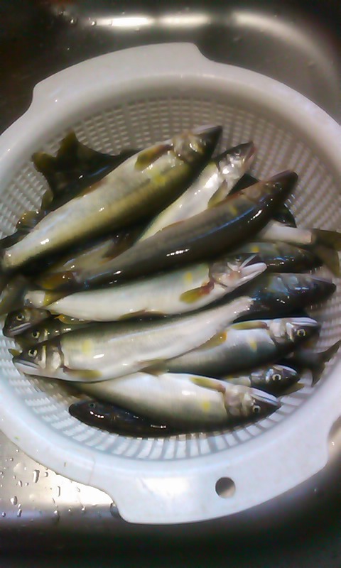 • 今日は、気合いを入れて4時起床。5時前には喫茶JBに到着。先週のポイントに向かいます。淵のポイントにはすでに先客。めざす上流には誰もいません。10cmほど水位があがったようですが、まだまだ渇水です。先週、竿を出せなかったポイントに入れるも、反応がありません。あちこち探っておとりが弱ってしまいました。2匹目もダメです。おもりを付けて沈めると、ようやく来ました。16cmのおとり頃です。これを泳がすと一発! ポンポンと掛かりますが、続きません。ときどき掛かりますが、単発です。9時過ぎるとピタリと止まっていまいました。淵のポイントも帰るひとがちらほら。掛かっていないようです。朝からいる人に聞いてみると、朝方に掛かっただけで、ぱったりだそうです。下流の人もあがってきました。昼にするそうです。ここのポイントから下流を攻めてみます。おとりを放して自分が下流に移動して上飛ばしの作戦です。早速1匹。ポイントごとに掛かります。段々瀬に入るところでは、明らかな竿抜けで入れ掛かり! 20cmも来ました。ここで挽回して15匹ほど追加しました。朝から淵に入ったひとも帰ったので、このポイントを最後に攻めてみます。サイズはだいぶ小さくなりますが、数匹かかり、15時に終了。27匹でした。