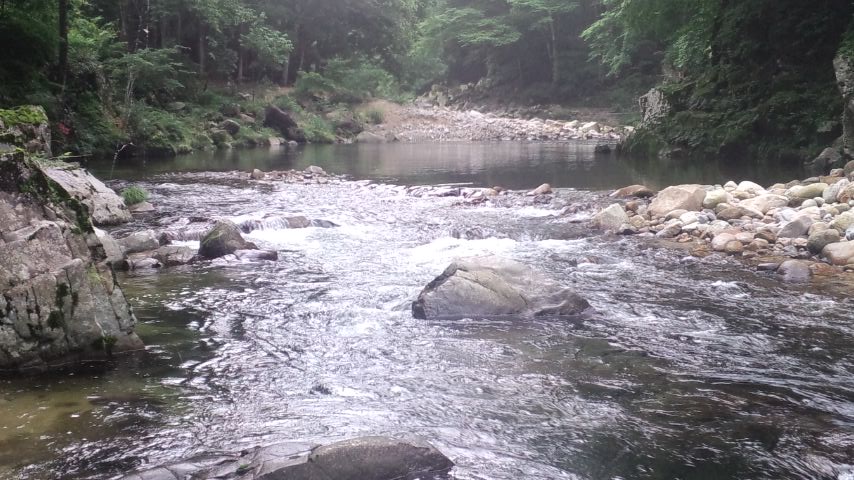 • 第2ラウンドは大杉橋。上から覗くと結構な人が入っています。ずっと下流に淵が見えるので、このポイントを目指します。が、行けども行けども、釣り人がおり、入るポイントがありません。下野でばっちりかためた人たちがいます。