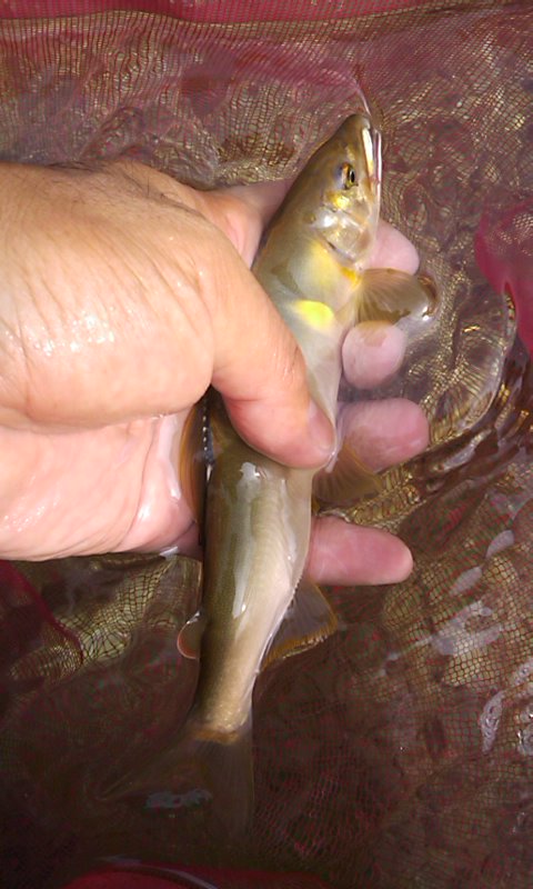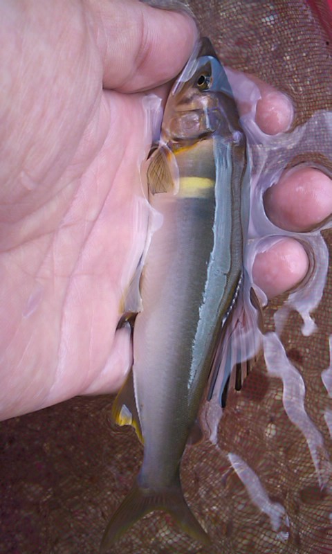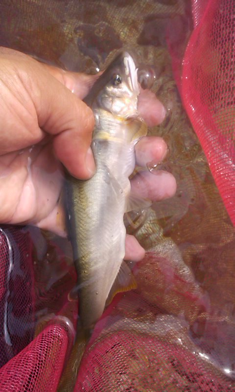 - 恵那漁協管内の小河川の解禁2週目です。先週の2日間に続き、3つ目の河川へ。ずいぶん早く出たつもりでしたが、目指すポイントにはすでに竿を出している人が。。。次のポイントに入ります。いつものおとり取りのポイントに入れますが、なかなか掛かりません。ようやくヒットしますが水中バレ。上の段に入れるとすぐ掛かりますが、これまた水中バレ。最後のポイントに入れると、これまたすぐ掛かりました。ようやくおとりが代わりました。これにおもりを付けて強い流れのポイントに入れると、、1発! これは石に巻かれて外れました。バレまくりです。ここぞというポイントで掛からず、次が来ません。河原の砂地をみると前日と思われる足跡が。。どうやら抜かれた後のようです。掛かりが悪いはずです。こうなると、おもりを付けてへちぎりぎりを狙います。ようやく目が覚めるようなアタリで18cm、続けて19cm。この川ではお盆くらいにならないと掛からないようなサイズです。