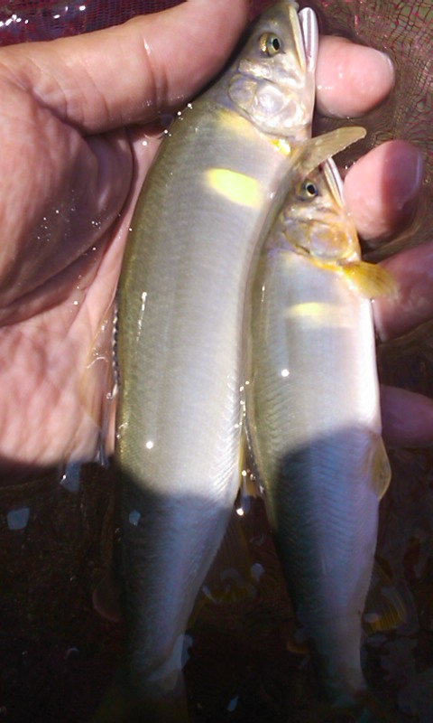 - 恵那漁協管内の小河川の解禁4週目です。夏休みを取り3連休鮎釣り三昧です。月曜日に大雨、引き際の木曜日にさらに降り、水位はかなり高い状況ですが、唯一、絶好の水位の川があります。まずは付知で親を調達。付知はとても竿をだせる状態ではありません。急いで戻りますが、目指すポイントには釣り人。いつもの定番ポイントに入ります。例年なら40〜50は出そうな雰囲気ですが、川の流れも変わってしまい、ポイントが少なくなりました。まずは緩い流れに入れると、ポンポンと3匹きました。口掛かりなので、追いは良くありません。かならず出るポイントはさっぱりです。流芯の強い流れに入れて、残りアカの大石周りに誘導すると、目印が飛びました。18cm! 続けて4連発。朝から調子がいいと思いましたが、それ以上はかかりません。1週間、竿が入っていないので、超一級ポイントに着いているようですが、魚影が少ないせいか、それ以外のポイントではさっぱりです。足で稼いで10時過ぎにはツ抜けしました。遠くに団体さんが入っていたと思っていたのですが、どうやら恵那漁協の人たちのようで、次の日の子供釣り教室のおとりを取っていたようです。彼らがあがると、川には誰もいなくなりました。下流に移動して超一級ポイントに入れると、目が覚めるようなアタリがあり、棚を2つ下られました。今期最大の21cm超え。立派です。