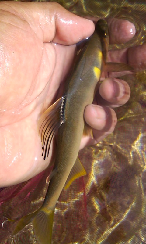 • お盆休みの3日目。今日はおとりは元気なようです。解禁2日目に良い思いをしたポイントへ。300mほど釣り上がりますが、ちびが2匹のみ。下流200mをさぐり、最後の段々瀬へ。ここでようやくでました。前半戦は7匹。
