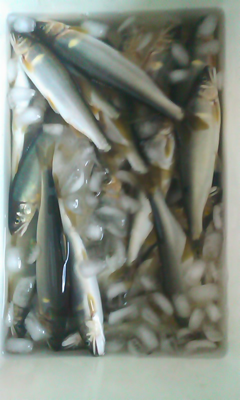 - 幸先がいいですが、その後30分ほど掛からず。ずっと上流に向かいます。前回、入れ掛かりがあったポイントに入りますが、魚影が見えません。ここで雨が降ってきたので、雨宿りしながら休憩です。近くのポイントで2匹。更に上流の堰堤を超えて、強い流れのポイントを攻めます。そこから次の水遊びポイントまでぽつりぽつりと稼いでツ抜けです。さらにもうひとつ堰堤を超えて行きますが、50mで1匹くらいのペースでしょうか。次の堰堤上では魚影が見えなかったので、ずっと下ります。最後の堰堤は釣り専用区の旗があったのですが、これには騙されました。一人釣り人が見えますが、かなりのペースで釣り下っていきます。こちらはゆっくりポイントをつぶして行きます。朝とばしたポイントを丁寧に攻めて、ここでもぽつりぽつりと稼いで行きます。釣り人が近づいてきました。鮎ルアーで掛からないので、おとりを売ってほしいとのことです。舟の鮎をタモを開けるとどっさり出てきたので、お金を払うということですが、ここは気前良く2匹進呈しました。阿木の人なので、店によってくださいとのことです。14時過ぎに雲行きが怪しくなったので終了としました。27匹。ほとんどが20cmを超えています。