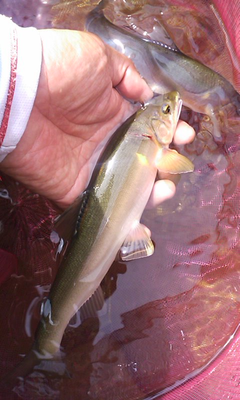 - 週末に付知が良い状態になるのは久しぶりではないでしょうか。管内の小河川は湖産鮎のため、早めに終了です。今日は付知です。込みそうなので5時半に出発します。喫茶JBでおとりを調達しますが、近くで尺鮎がでたそうです。下流に戻り、知原橋から入ります。今日は小学校の運動会のようで、子供達が楽しそうに挨拶してきます。橋下には一人入っていたので、ずっと下流の強い流れのポイントに向かいます。2.5号のおもりを付けて強い瀬が終わるところに誘導すると、鋭いアタリがありました。一気に下っていきます。ここは足場が悪いので、鮎について行けません。何度も転び、とうとう竿と糸が直線になってしまいました。もうダメかと思いましたが、なんとか竿先を左右に振って流れの緩いところに落ち着いたところで、大岩の上を走って下流に行きます。胸びれのところにがっちり掛かっていたので外れませんでした。26cm!!