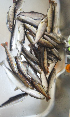 - 3時半に起床、4時半に現場到着。ちょうど瑞浪の鵜飼さんも到着です。この人とはほんと時間帯が一緒になります。今日は漁協の放流のお手伝いをするとのことです。6時半に受付をして、3000円を支払い、おつりの500円は寄付です。目指すポイントに入れましたが、去年より浅くなっています。アマゴがたまるかどうか分かりません。待っていると漁協の人たちが来ました。鵜飼さんが近くに放流してくれました。いつもより少ない感じですが、自分のポイントに流れ着くのをいのります。長い長い2時間を過ごしますが、開始ちょっと前に鵜飼さんが対岸に現れました。入るところが無いようです。ここに見えるよというと、しばらくしたら現れました。ずいぶん歩いたようです。ほどなく8時30分になり、大会がスタート。自分の前にはアマゴがたまり、コンスタントに掛かりました。鵜飼さんのところは良くなかったようで、しばらくすると移動していきました。まわりもあまり掛かっていないようです。11時過ぎると食いは渋くなりましたが、糸を0.1号まで落としてさらに掛けて行きました。13時30分に終了。帰宅してさばくと39匹。解禁日と全く同じ数でした。