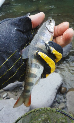先週の駐車場所に到着。軽トラがたくさん停まっています。地元で行事があるようです。空いたスペースにとめて、下流に入ります。先週会った工事の人が良いと言っていたポイントです。降りれそうな場所を見つけると、あっさり河原に着きました。最近の足跡もあります。平瀬と小さな淵が交互に続いています。ここでは、かなり広い範囲を攻めて5匹ほど追加しました。