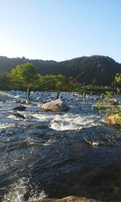 • 対岸の女性の方が調子良く掛けています。竿の変な操作をせずにオトリ任せに泳がせています。自分が6匹目を掛けたときにはもう2桁に乗せていたと思います。対岸は好循環、自分は悪循環。ウグイは掛かるは、大型アマゴを掛けてドンブリ、ようやく掛けたと思ったら、ちょうど対岸に入った人の竿が寝ていたため竿を立てることが出来ず石に擦れて親子丼。。。。。