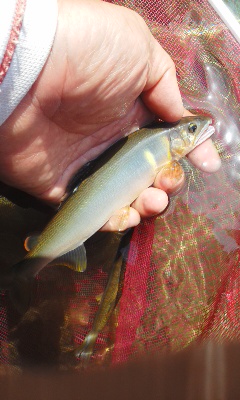 1匹目は実に2時間以上経ってから、8時半でした。オトリと同じくらいのサイズのアユが掛かりました。
